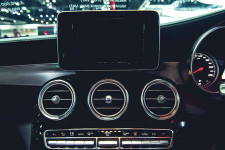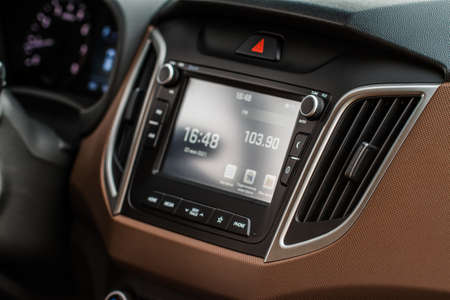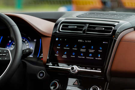 Modern car media display in the interior of the car. Touchscreen monitor on the dashboard of the modern car.