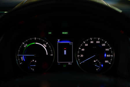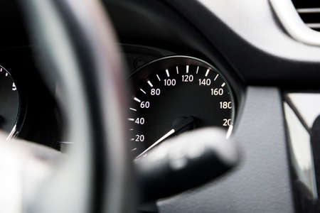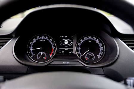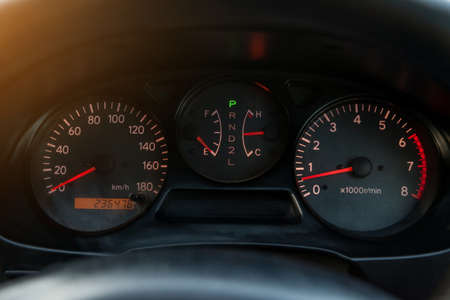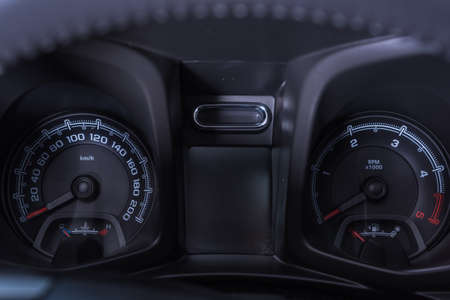 Close up shot of a speedometer in a car. Car dashboard. Dashboard details with indication lamps.Car instrument panel. Dashboard with speedometer, tachometer, odometer. Car detailing. Modern interior