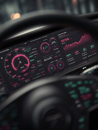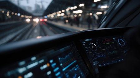 Closeup of a maglev pods control interface displaying an array of data points and visualizations where AGI algorithms analyze nearby pod speeds and predicted movements to ensure seamles