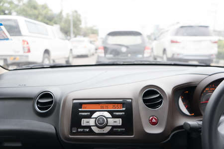 Torpedo in the car, tape recorder, the included radio in the evening dark light. Blur Selective focus.