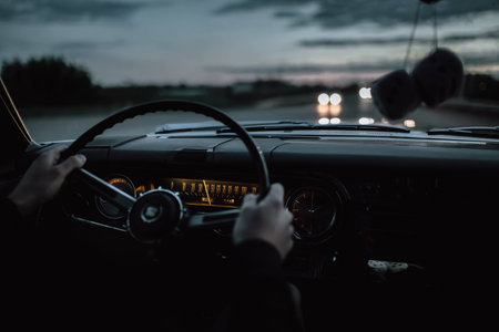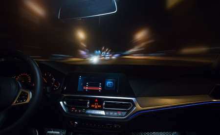 Night Time Driving. Car Cockpit View with Shallow Depth. Traveling at Night.