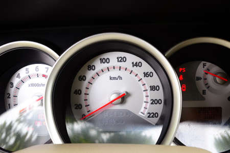 Speedometer in the car on the dashboard. The cars speedometer shows 100 mph