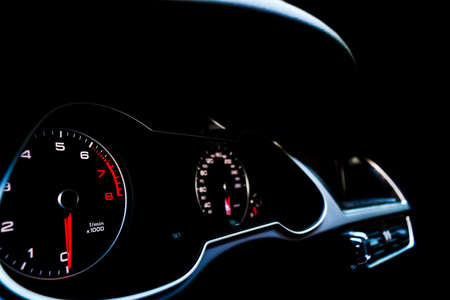 Rev Counter Tachometer Instrument in Modern Car Dashboard. Revolution-Counter Measuring Device. Automotive and Transportation Technology.