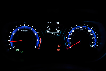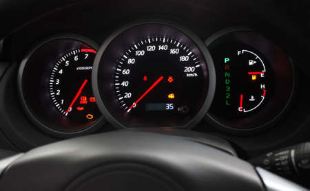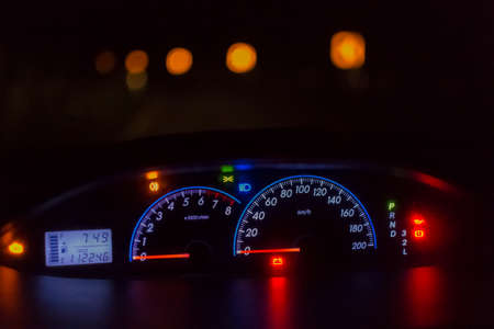 dashboard of the car is illuminated by bright illumination. Speedometer, circle tachometer, oil and fuel level under the yellow and orange neon color
