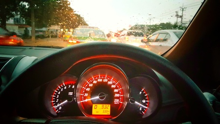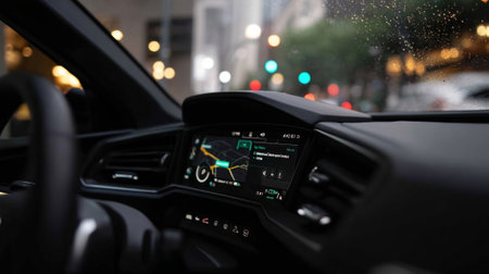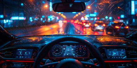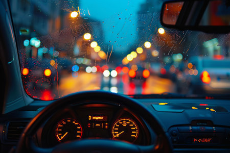 The interior of a car driving on a busy city street at night in the rain with bokeh effect