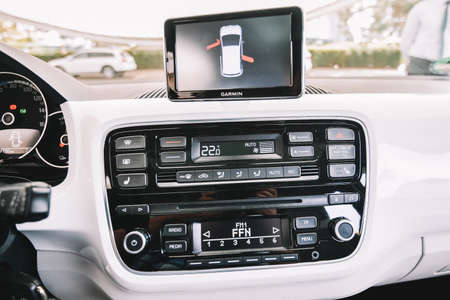Wolfsburg, Germany - June 19, 2016: Volkswagen E-UP electric car, view of the dashboard. Volkswagen is a German car manufacturer headquartered in Wolfsburg, Germany.