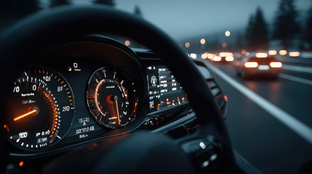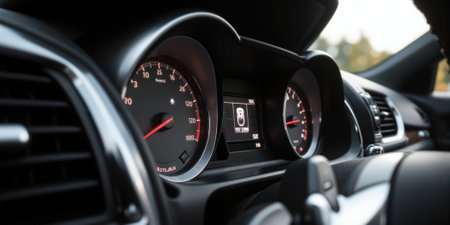 Close up View of Illuminated Car Dashboard Gauges with Focus on Speedometer and RPM Vehicle Interior Details in Warm Light AI Generative