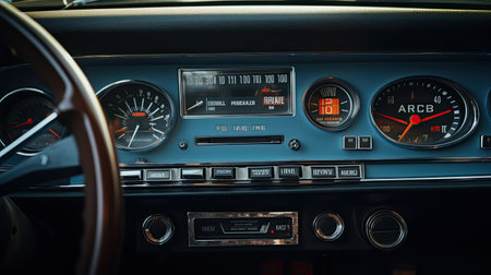 The handcrafted dashboard of a classic car featuring a of analog dials and glowing indicators reminiscent of a bygone era