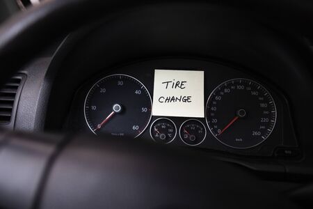 Writing tire change on memo post reminder. Text on sticky paper inside car dashboard.