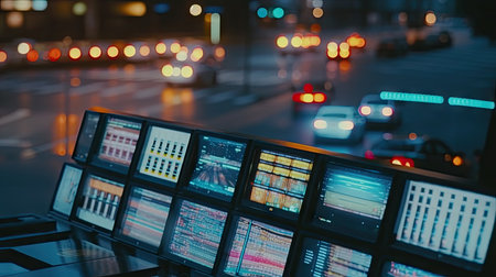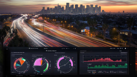 A stunning cityscape showcases a vibrant skyline at dusk, highlighted by flowing traffic and dynamic data visualizations. Perfect for technology and urban themes.