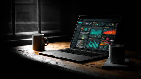 In a dimly lit workspace, a laptop showcases a vibrant dashboard user interface, accompanied by two coffee mugs on a rustic wooden table.