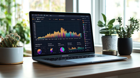 A modern laptop displays a vibrant analytics dashboard with colorful graphs and performance metrics, set in a stylish workspace adorned with plants.