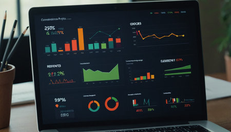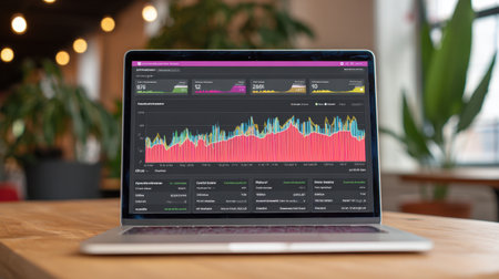 A sleek laptop shows a modern digital dashboard with colorful data visualizations and analytics, set in a contemporary workspace, perfect for business insights.