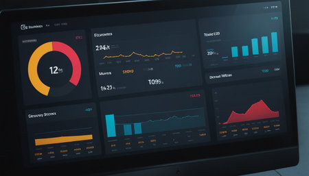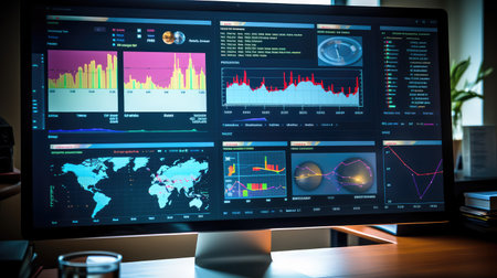 High-resolution image of a sleek data dashboard on a computer monitor showcasing financial analysis with various statistical graphs and trends.