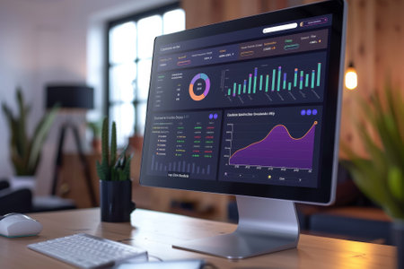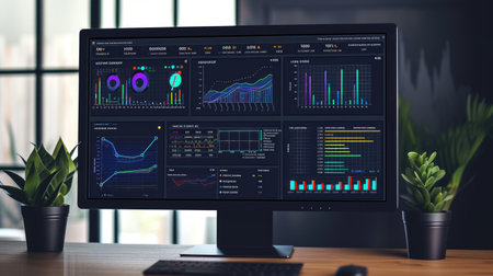 Close-up of a computer screen displaying colorful data visualizations and graphs in a bright office environment, highlighting financial metrics and analytical insights for business growth.