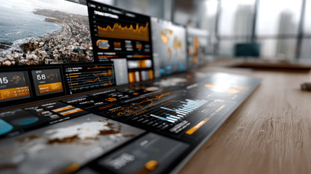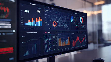 A detailed view of a professional business dashboard showcasing various analytical data on a digital screen in a contemporary office setting, perfect for presentations.