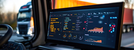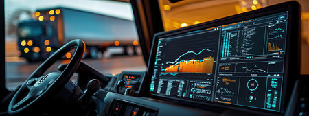 Close-up view of a sleek vehicle dashboard featuring advanced technology, displaying performance metrics and navigation tools for a modern truck driving experience.