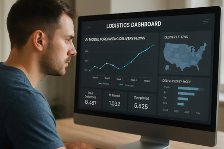 Logistics manager analyzing delivery flows on a computer screen, using artificial intelligence and data visualization tools to optimize supply chain operations in the United States