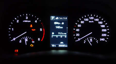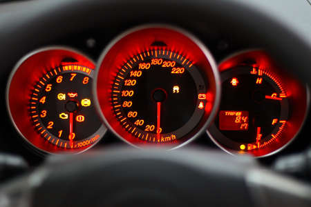 dashboard of the car is illuminated by bright illumination. Speedometer, circle tachometer, oil and fuel level under the yellow and orange neon color