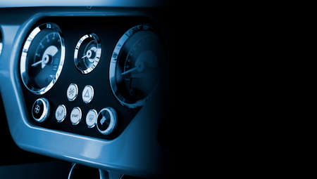 The handcrafted dashboard of a classic car featuring a of analog dials and glowing indicators reminiscent of a bygone era