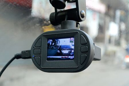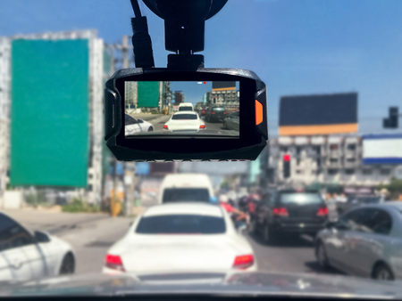 Many car dash cam (DVR) mounted on the dirty front windshield, recording the traffic ahead in case of an emergency situation or an accident