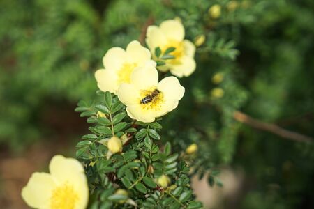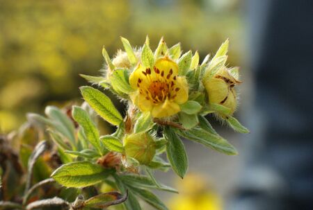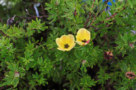 Beautiful close-up of a potentilla. Cute bush with delicate yellow flowers