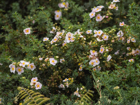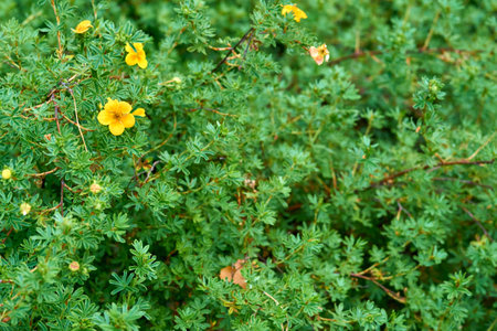 Shrub cinquefoil flowers on green bush deep in the garden closeup view