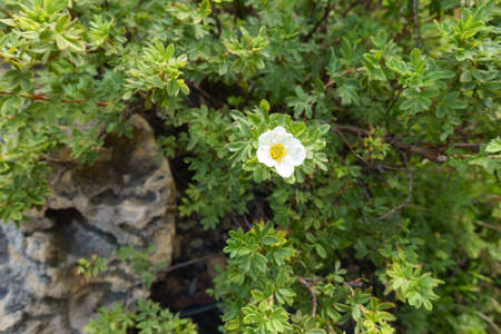 Single white flower in the leafage of Dasiphora fruticosa in July