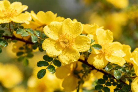 Yellow Potentilla fruticosa flowers blooming in June 2025 in the mountains of Uzbekistan. Perfect for nature, eco, and botanical themes.