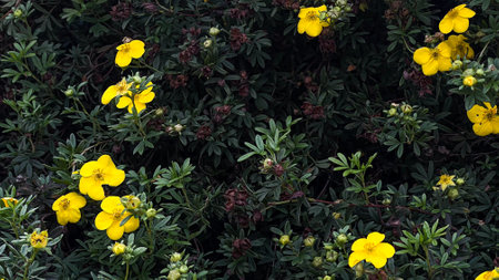 Yellow flowers Potentilla fruticosa Shrubby Cinquefoil. Bright yellow blossoms of Potentilla fruticosa stand out against lush green foliage. A vibrant summer shrub with dense flowering.