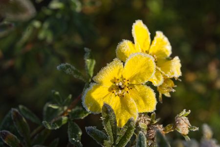 Blooming bush of a wild cinquefoil (Pentaphylloides fruticosa) on a dark green natural background.