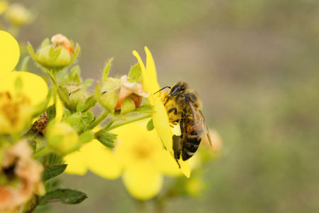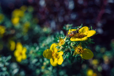 Macro of a bee, bombus, on a potentilla fruticosa blossom with blurred bokeh background pesticide free environmental protection save the bees biodiversity concept.
