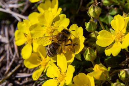 In a vibrant meadow yellow flowers of Potentilla reptans attract bees during a sunny afternoon creating a lively atmosphere filled with nature's beauty.