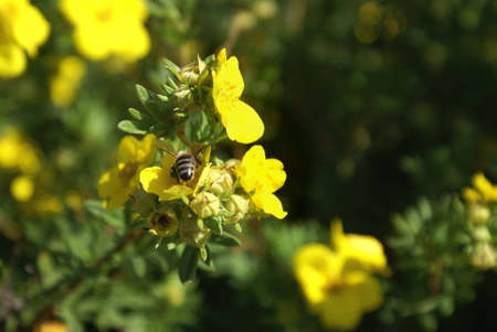 A close up image of a yellow honey bee on a yellow Potentilla flower.