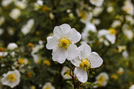 Two beautiful white flowers with yellow centers and water droplets in a garden. Close-up of delicate white flowers with yellow centers covered in water droplets, set against a blurred green backdrop.