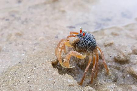 An interesting crab is waiting on sand to eat, high quality, high resolution