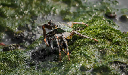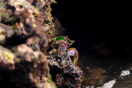 Small crabs crawling on the rocks on the shore. Coral reef wildlife