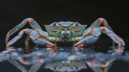 An AI-generated illustration of a beautiful red crab on a wet reflective surface.
