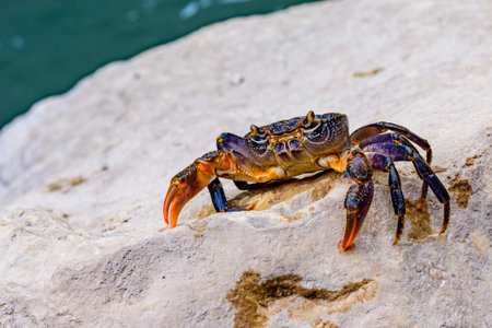 Crab on the rocky coast of Mediterranean sea in Greece