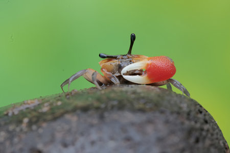 Close up of a fiddler crab against a dark backdrop. Generative AI