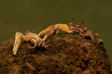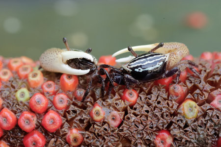 A fiddler crab preying on another fiddler crab whose body size is smaller than its own. This animal has the scientific name Uca sp.