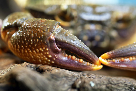 Saltwater crayfish close up crab sitting on rock stone in sun with large big massive pincers claws concept marine life animal portrait