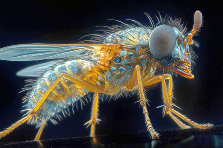 An AI generated illustration of a vibrant fly against a black background