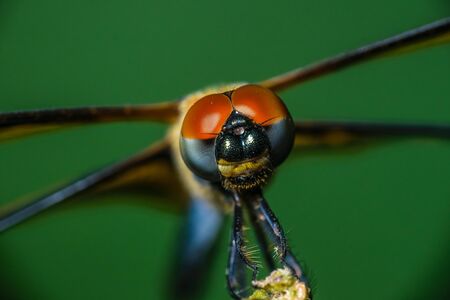 A macro shot of a dragonfly with selective focusing on its head