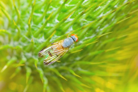 Fly with red eyes sits at the thistle