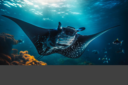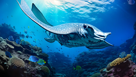 Underwater image of big ray swimming next to big school of fishes in ocean