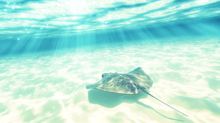 Diver and stingray meet on a sunlit sandy bottom. Marine life interaction captured underwater. Concept of aquatic wildlife, ocean exploration, and respectful wildlife encounters.
