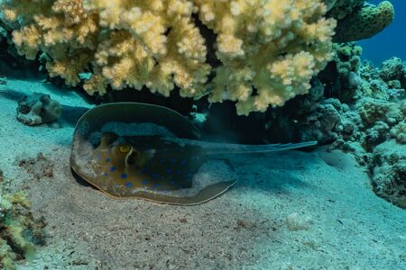Bluespotted stingray floatin underwater over corals. Red sea fish. Closeup portrait.