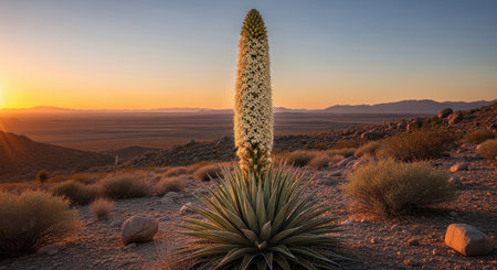 Blooming desert yucca at sunset with dramatic sky