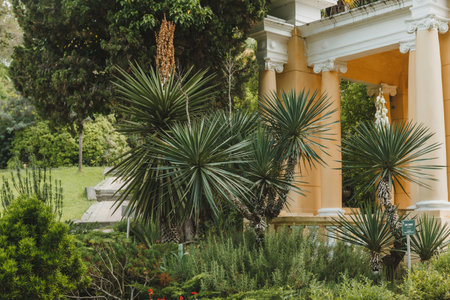 A fragment of a beautiful park with Yucca rostrata palms on a bright sunny day.